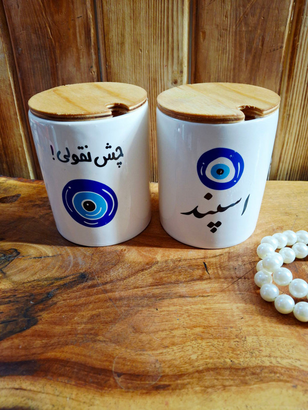 جا اسپندی سرامیکی استوانه چشم نظر🧿🧿 یک محصول فانتزی از جنس سرامیک با درب چوبی میباشد بسیار مناسب اکسسوری اشپزخانه و جهیزیه عروس است. جنس: سرامیکی جنس درب: چوبی